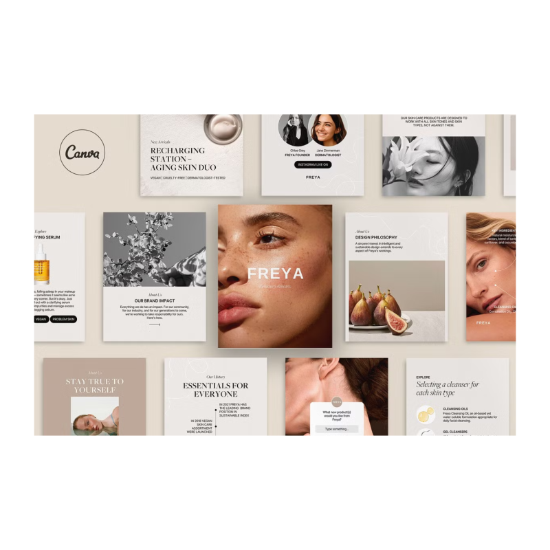 تم إنشاء مجموعة Freya Social Media Kit من Studio Dara في Canva وتتميز بجمالية بسيطة ومثالية لماركات العناية بالبشرة والجمال والمؤثرين واستوديوهات التصميم. تتضمن الحزمة 42 نموذجا فريدا بدقة 1500 × 1500 بكسل. يتصفح معظم المستخدمين خلاصات Instagram الخاصة بهم على هواتفهم - وحجم الصورة الشخصية في Instagram أساسي للجوال. تم تحسين المنشورات الشخصية لخوارزمية Instagram ويمكن أن تكون ملفتة للنظر للغاية في موجز مليء بالصور المربعة. لقد أنشأنا أنماط منشورات بورتريه مختلفة بحيث يمكنك مشاركة المنتجات والخدمات والأخبار والعروض الترويجية والاتجاهات والاقتباسات والصور النابضة بالحياة ورسائل الحث على اتخاذ إجراء والمزيد لجذب الجمهور المستهدف المناسب. وفر وقتك وأموالك وأنتج عملا عالي الجودة.